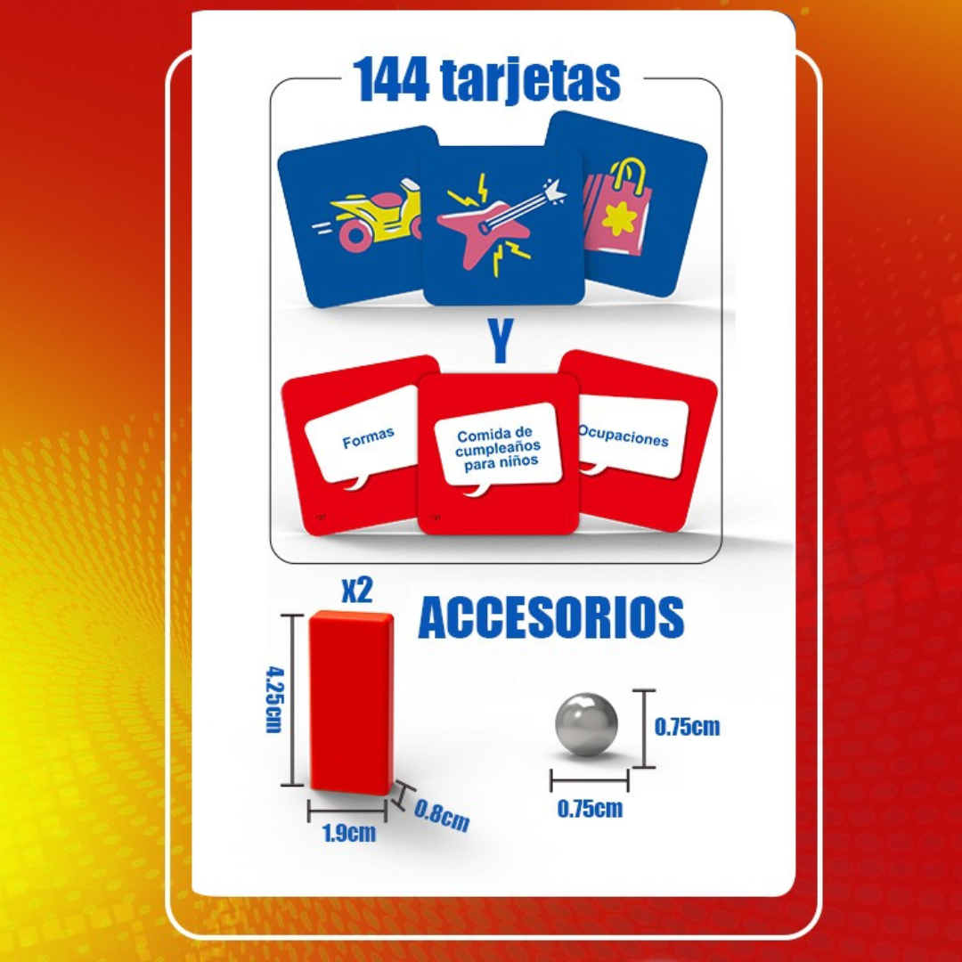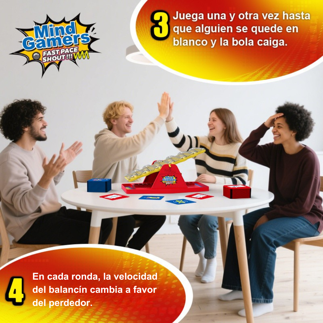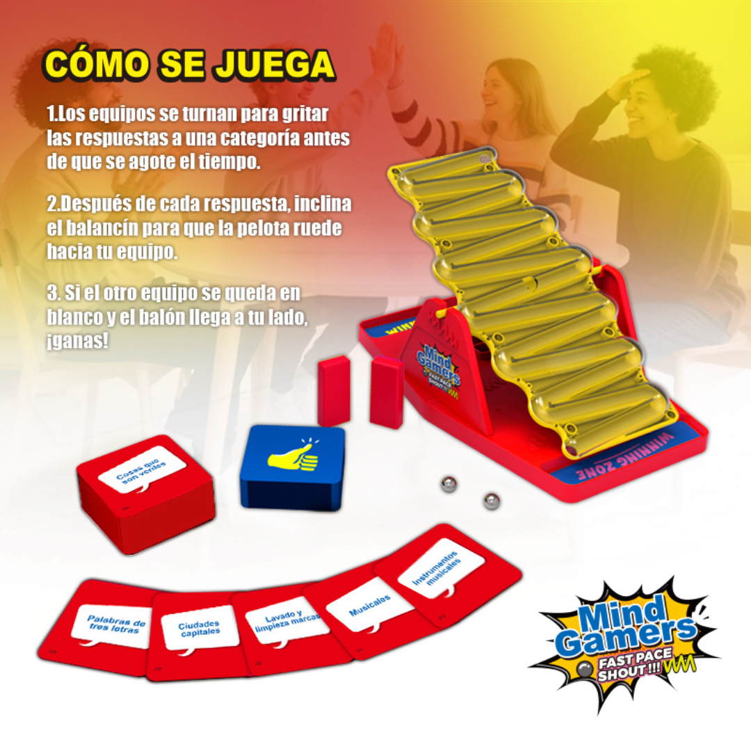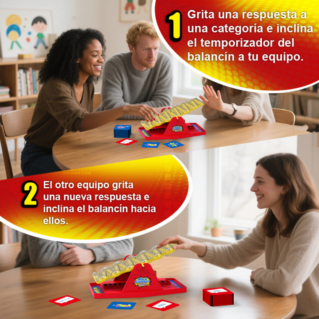 ¡El juego que hará que todos griten respuestas mientras la adrenalina sube! Compite por equipos, responde categorías a toda velocidad e inclina el balancín para empujar la bola hacia tu lado. Si el otro equipo se queda en blanco… ¡ganas! Risas, tensión y velocidad en cada ronda. ¡Ideal para reuniones épicas!